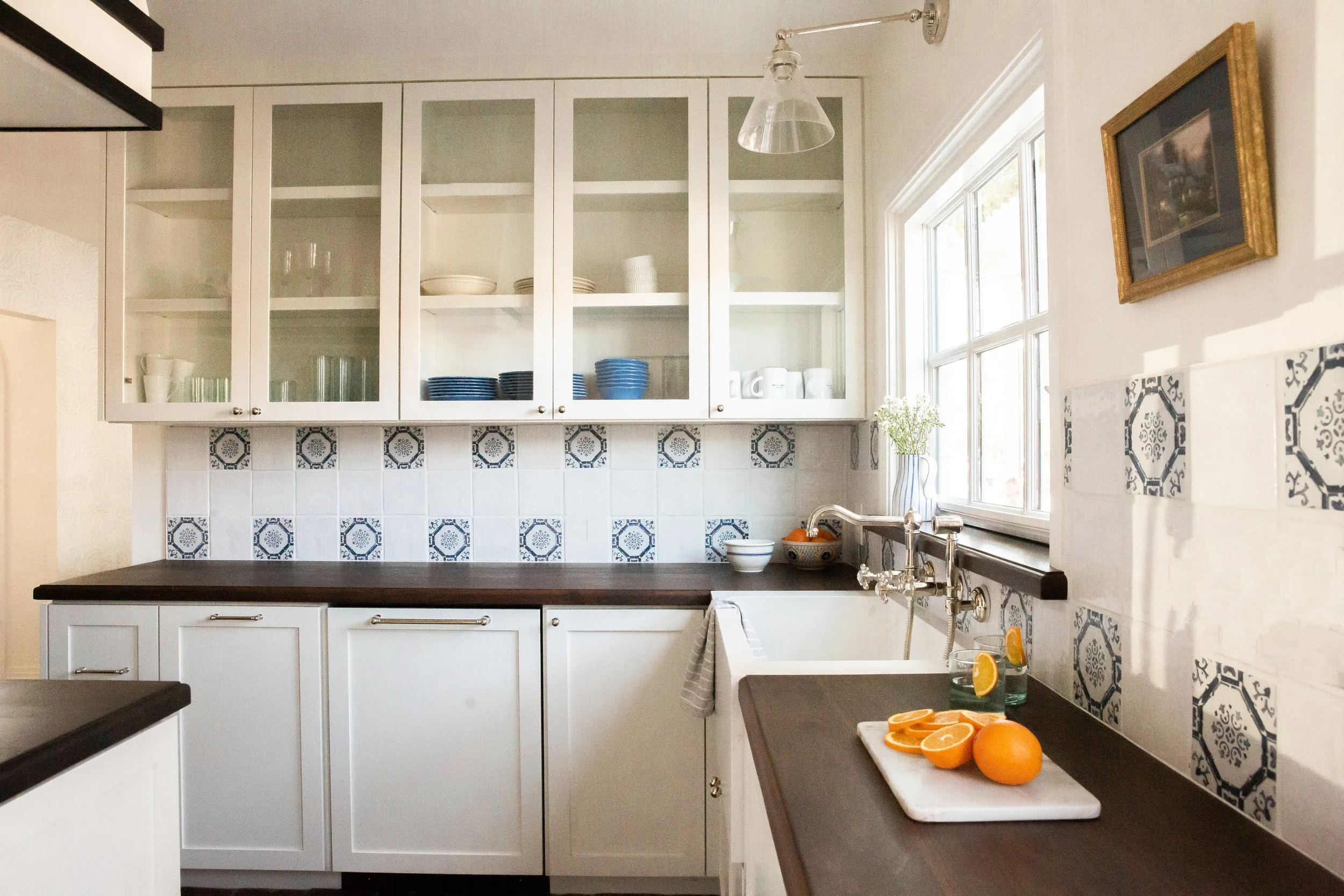 To give the kitchen an authentic Spanish foundation, we introduced hand-painted blue-and-white tile as the backsplash. Its subtle imperfections and artisan character brought depth without overwhelming the compact footprint. On the floor, we installed terracotta star-and-cross tile imported from Mexico—warm, matte, and full of natural variation. Together, these materials define the palette for the entire kitchen and give it a sense of history and craftsmanship that aligns with the architecture of the home.